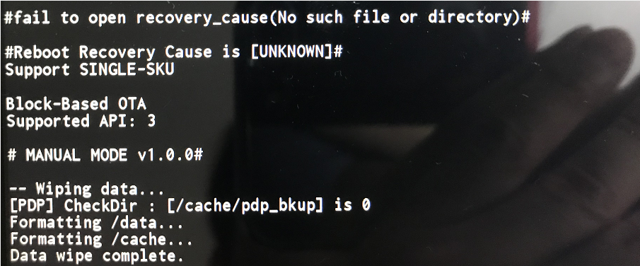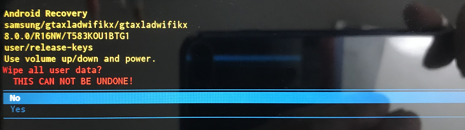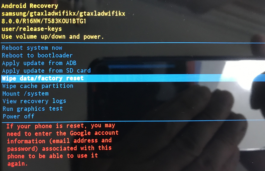 3. 항목 중에 "Wipe data/factory reset" 항목을 선택 (볼륨 키를 통해 위/아래로 이동하고, 전원 버튼을 통해 선택)