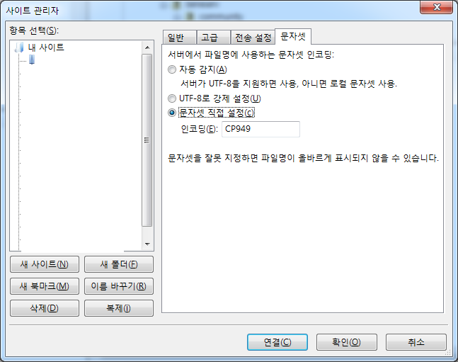 파일(F) > 사이트 관리자 > 문제발생 FTP 선택 > 문자셋 > 문자셋 직접 설정(c) 선택 > 인코등(E) CP949